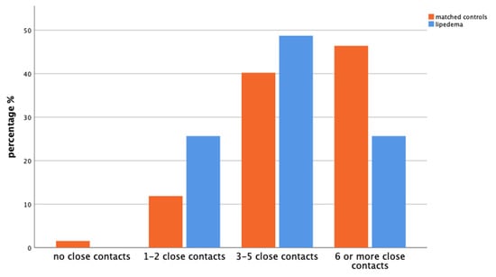 Bar chart with comparison of the percentage of matched controls (orange, left) and patients with lipedema (blue, right) based on the answers regarding the number of close contacts of the GEDA-19 questionnaire (p = 0.032).