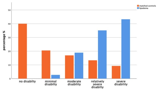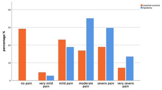 Patients with lipedema experience higher levels of pain (p < 0.001) and more significant disability in daily activities (p < 0.001) compared with controls. In the control group, 29.2% reported no pain, whereas 7.2% experienced very severe pain. On the other hand, none of the individuals with lipedema reported being free from pain; 13.5% reported very severe pain (Figure 5).