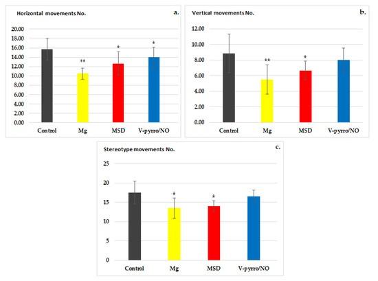 The actimeter test revealed that the use of Mg significantly reduced the locomotor activity of the rats compared to the control group. When assessing spontaneous behavior, Mg showed significant differences (** p < 0.01) in horizontal (10.50 ± 1.22 vs. 15.67 ± 2.34) and vertical (5.50 ± 1.87 vs. 8.83 ± 2.48) movements (Figure 1a,b) and a less-pronounced effect on stereotype (13.67 ± 2.66 vs. 17.33 ± 2.94) movements (* p < 0.05) compared to the group that received a saline solution (Figure 1c). Rats treated with MSD exhibited a notable decrease (* p < 0.05) in spontaneous activity in the horizontal (12.67 ± 2.50 vs. 15.67 ± 2.34) and vertical (6.67 ± 1.21 vs. 8.83 ± 2.48) planes, as well as in the number of stereotype (14.40 ± 1.38 vs. 17.33 ± 2.94) movements, in comparison to the control group (Figure 1a–c). The effects of MSD on the total locomotor activity were less pronounced than those of Mg in this experimental behavioral model in rats. V-pyrro/NO showed a significant variation (* p < 0.05) only in horizontal movements (14.00 ± 2.19 vs. 15.67 ± 2.34) (Figure 1a).