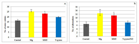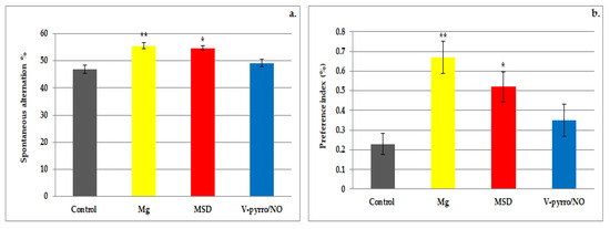 Both the use of Mg and MSD resulted in a significant increase in the rate of spontaneous alternation (55.5 ± 1.05 and 54.67 ± 0.82, respectively, compared to 46.83 ± 1.6) and in the preference index (0.67 ± 0.08 and 0.52 ± 0.08, respectively, compared to 0.23 ± 0.05) when compared to the control group. The effects were more pronounced for Mg (** p < 0.01) than for MSD (* p < 0.05) in this behavioral experimental model in rats (Figure 3a,b). The administration of V-pyrro/NO did not lead to any statistically significant changes in either the spontaneous alternation rate (49.14 ± 1.47 vs. 46.83 ± 1.6) or the preference index (0.35 ± 0.08 vs. 0.23 ± 0.05) when compared to the group that received a saline solution (Figure 3a,b).