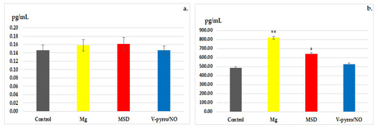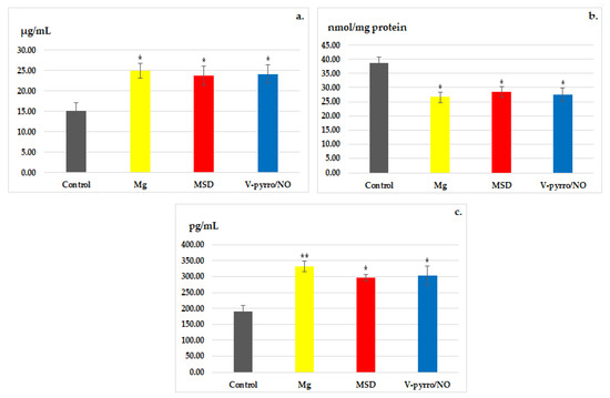 Laboratory analysis revealed a significant increase in the activity of GPx as a result of Mg administration (** p < 0.01), and a less-pronounced increase (* p < 0.05) in GPx activity was observed for both MSD and V-pyrro/NO administration (Figure 5c).