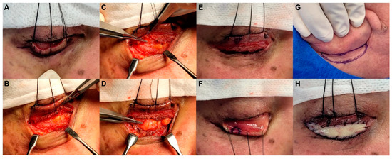 Ectropion correction surgery procedures, including lateral tarsoplasty combined with a full-thickness skin graft (FTSG). (A) The incision was made through the previous subciliary incision line used for the previous facial fracture surgery. (B) Dissection proceeded above the orbital septum. (C,D) The surrounding scar tissues were removed, and the adhesion was released. (E,F) Lateral tarsoplasty, including a full-thickness pentagonal skin-tarsal-conjunctival resection with 5–7 mm width, was performed at approximately 5 mm medial to the lateral canthus. (G,H) FTSG from the postauricular area was performed between the skin incision areas.