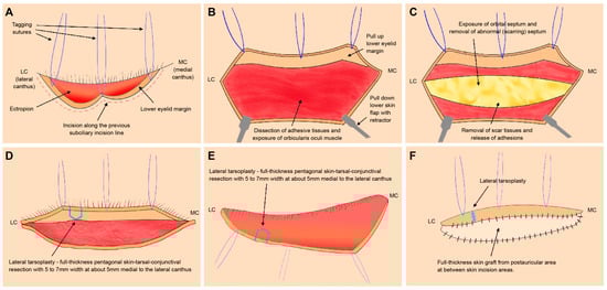 A schematic illustration of the lateral tarsoplasty combined with a full-thickness skin graft (FTSG) for correcting severe lower eyelid ectropion following the subciliary approach for infra-orbital rim fracture. (A) An incision was made through the previous subciliary incision line used for the previous facial fracture surgery. (B,C) Dissection was performed above the orbital septum, the surrounding scar tissues were removed, and the adhesion was released. (D,E) Lateral tarsoplasty, including a full-thickness pentagonal skin-tarsal-conjunctival resection with 5–7 mm width, was performed at approximately 5 mm medial to the lateral canthus. (F) Following the lateral tarsoplasty, FTSG from the postauricular area was performed between the skin incision areas.