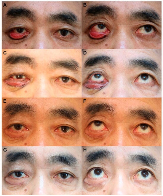A 62-year-old male patient presented with ectropion of the lower eyelid at a 20-day follow-up after an ORIF performed through the subciliary approach for managing infra-orbital rim fracture. The ectropion worsened over time, despite an initial encouragement for gentle massage. Lateral tarsoplasty combined with FTSG was performed at the 1.5-month follow-up after ORIF (Figure 3A,B). No postoperative complications were observed, with successful skin graft integration at the 5-day follow-up. Subsequent evaluations at 10 days (Figure 3C,D), 6 months (Figure 3E,F), and 12 months (Figure 3G,H) revealed no ectropion relapse, and the patient was satisfied with the outcome. At the final follow-up, the PSAS total, OSAS total, overall patient satisfaction, and objective scar rating scores were 11, 17, 3, and 4, respectively.