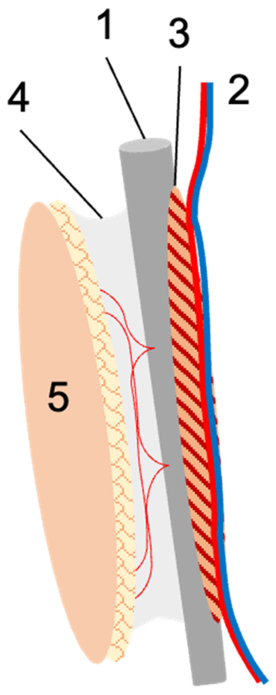 Schematic illustration of the fibula flap. The fibula (1) is harvested with the nourishing peroneal vessels (2), and for optimal periosteal perfusion, usually a small muscular cuff (3) is included. If needed, the lateral intermuscular septum with its perforating vessels (4) is harvested with the flap, upon which a skin island (5) can be based. In the case of free fibula transfer, the peroneal vessels are re-anastomosed at the recipient site. In the case of pedicled transfer, the fibula remains in the donor leg and is used for tibial reconstruction. The vascular pedicle is transected either distally or proximally to obtain a proximally or distally pedicled fibula graft.