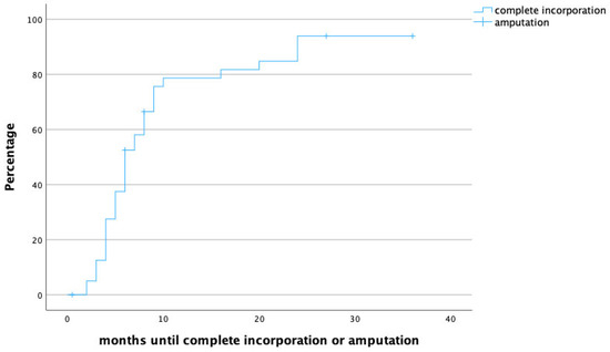 The median follow-up time was 20 months (IQR 8.5–31.5), and the median time to full osseous integration was 6 months (IQR 4–8.25) (Figure 1 demonstrates time to heal by means of a survival chart). The median time to proximal incorporation was 6 months (IQR 4–8), slightly longer than time to distal incorporation (median 5, IQR 4–8 months). Figure 2 displays time to heal by means of an inverted survival chart. The higher the curve, the more fibulae have successfully healed.
