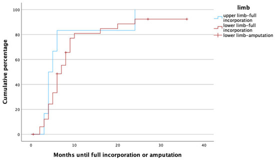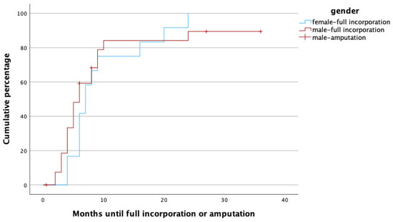 Postoperative complications requiring revision surgeries occurred in 11 (27%) patients. In six (15%) patients, secondary limb amputation was necessary due to recurrent osteomyelitis (n = 3, 7%), graft failure (n = 2, 5%), and acute extremity ischemia after surgery (n = 1, 2.5%). Amputation was only performed in men and in the lower limbs after a median time of 7 months (IQR: 4.63–29.25, see also Figure 1). Further complications encompassed pseudarthrosis formation (n = 3, 7%), external fixator pin loosening (n = 1, 2.5%), and fracture of the host bone (tibia, n = 1, 2.5%). This necessitated revision surgery in all of these cases after a mean time of 10 months (IQR: 6.5–19.5), resulting in eventual healing in four of five patients. One patient (2.5%) had persistent pseudarthrosis at last follow up and hence had to be excluded from our healing time analysis.