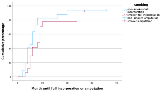 As one may have expected, active smoking was related to prolonged time to full incorporation. The adverse effects of smoking on fracture healing have been reported before on various occasions. For instance, smoking has been seen to prolong the healing times of tibial fractures or spinal fusions, as well as elective knee and foot surgery [30,32,33,34]. The same goes for conventional and vascularized bone grafts in upper and lower extremity reconstruction, where smoking was associated with a 75% decreased healing rate, and the number of pack-years correlated with longer healing times [24]. In fact, it has even been demonstrated that the amount of nicotine intake is closely correlated with healing times [34]. Conversely, smoking cessation after bone surgery for six months has been seen to reduce healing times so that it almost reaches non-smoker levels [33]. In our cohort, neither the amount cigarettes smoked nor the rate of smoking cessation after surgery were assessed. However, being an independent predictor of prolonged healing in our cohort, even stronger than PAOD (which was associated with the need for secondary amputation), age or gender, its adverse effects on unsuccessful healing of the vascularized fibula is obvious.