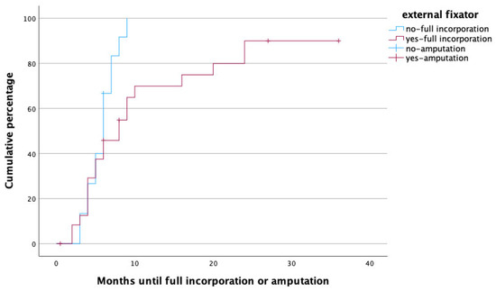 Time to heal in months for patients treated with (red) and without (blue) external fixator. Note that amputations (censored cases) were more frequently performed in patients with external fixator.