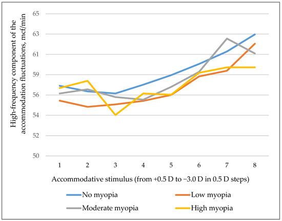 When assessing the coefficient of microfluctuations (CMF), we found that the frequency of ciliary muscle contractions was reduced in groups with low, medium, and high myopia compared with the group without ophthalmic pathology. The microfluctuation frequency was decreasing along with the increasing myopia degree (p