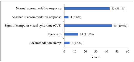 Accommodation pattern with signs of CVS was observed in 40.9% of non-myopic participants, eye strain in 11.9%, accommodation cramp in 4.5%, and absence of (little) accommodative response in 3.6%.