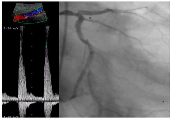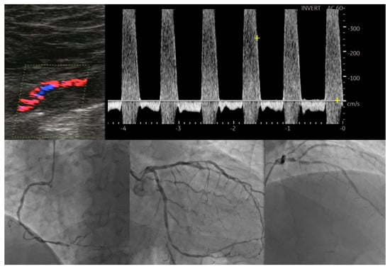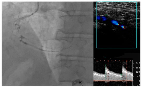 The renal resistive index (RI), renal pulsatility index (PI) and acceleration time (AT) are measurements reflective of intrarenal vasculature and are proven predictors of CV events []. In a cross-sectional study including 235 patients with acute coronary syndromes referred for CA, the relationship between the extent of CAD and renal Doppler parameters was evaluated. In patients with non-ST segment elevation MI, RI (β = 32.230, 95% CI 5343.15–2 × 1024; p = 0.008) and PI (β = −7.439, 95% CI 0.000–0.231; p = 0.015) were independent predictors of a moderate-to-high SYNTAX score, while, surprisingly, no predictors were found in the ST-segment elevation MI group []. Geraci et al. found that in patients with stable CAD PI was associated with the presence of mild atherosclerotic burden (p = 0.047), whereas this association was not identified in case of a higher GS (cut-off ≤30) []. What is more, an increased RI (driven mainly by lower end-diastolic velocities) is associated with a worse 24-month prognosis in a cohort of both stable and unstable patients referred for CA (OR 1.11 per 0.01, 95% CI 1.02–1.20; p = 0.02). There was impaired survival in patients with a pre-procedural RI above the threshold of 0.0645 (log-rank p < 0.001) [].