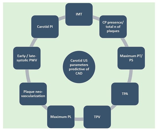 Carotid US-derived parameters predictive of CAD. CAD: coronary artery disease. CP: carotid plaque. IMT: intima-media thickness. N: number. PI: pulsatility index. PL: plaque length. PS: plaque score. PT: plaque thickness. PWV: pulse wave velocity. TPA: total plaque area. TPV: total plaque volume. US: ultrasound.