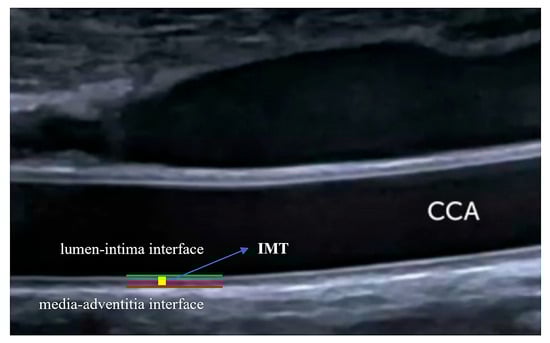 Intima-media thickness measurement. IMT is defined in the absence of carotid plaque as the distance between the lumen–intima and media–adventitia interfaces. Long-axis assessment of the far wall of the CCA is used. IMT: intima-media thickness. CCA: common carotid artery.