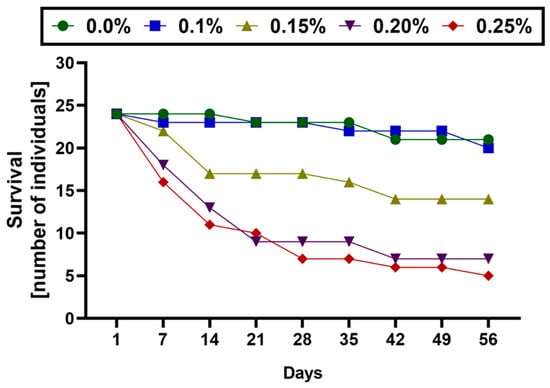 The mortality of the specimens was calculated based on the number of specimens that survived in each experiment with a comparison to the control. The differences in body length between the control and exposed groups were analyzed using a non-parametric Kruskal–Wallis ANOVA (due to some data not meeting the assumption of Gaussian distribution) with a post hoc Dunn’s test. All statistical analyses were performed using the Statistica v. 13 package (StatSoft, Tulsa, OK, USA), and GraphPad Prism 5.1 package (GraphPad Software, Inc., La Jolla, CA, USA) was employed to prepare graphical presentations of the results. A p-value below 0.05 was deemed statistically significant.