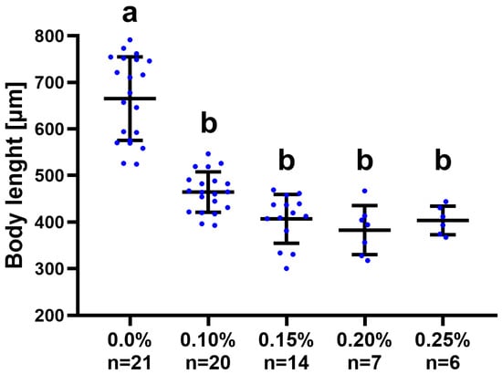 Differences in body length of the Pam. experimentalis in the control group and groups exposed to different magnesium perchlorate concentrations (0.1–0.25%). Blue points represent the body length of the individual specimens in each group, the horizontal line represents the mean, and the whiskers represent the standard deviation. Different letters above the columns denote statistically significant differences (p < 0.05) of pairwise post hoc comparisons (Dunn’s test following Kruskal–Wallis ANOVA).