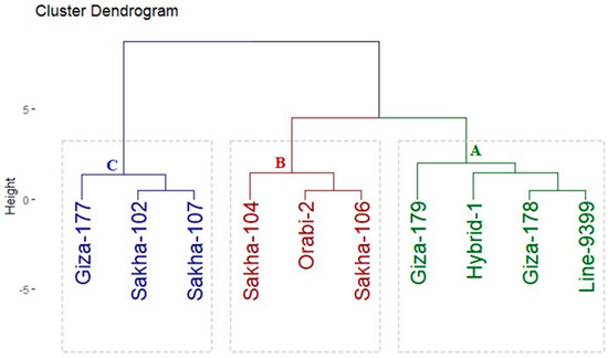- Sakran, R.M.; Ghazy, M.I.; Rehan, M.; Alsohim, A.S.; Mansour, E. Molecular genetic diversity and combining ability for some physiological and agronomic traits in rice under well-watered and water-deficit conditions. Plants 2022, 11, 702. [Google Scholar] [CrossRef]