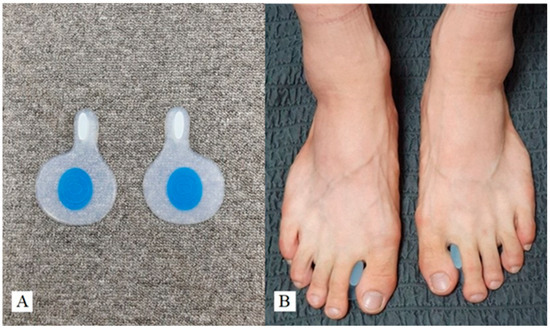 A soft silicone pad-type foot-toe orthosis (A) and application of a foot-toe orthosis (B).