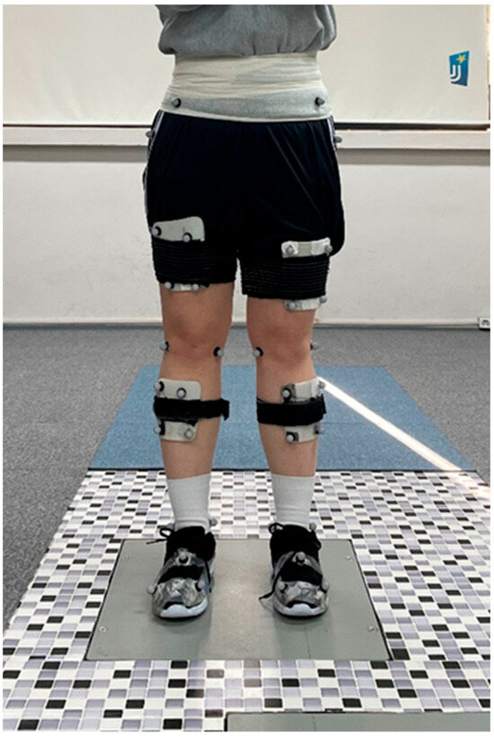 Forty infrared reflective markers placed on the participant’s pelvic and lower extremities to obtain the static calibration skeletal model and kinetic data.