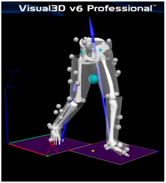 Visual3D analysis software v6 professional (C-Motion Inc., Germantown, MD, USA) was used to analyze the final GRF data following data acquisition using the Vicon Nexus software program and the 3D motion capture system. Visual3D software created a virtual static skeletal model for each subject based on reflective marker settings. The virtual static skeletal model was used to produce all virtual walking models during experimental gait trials (Figure 3). The X-Y-Z Cardan sequence was used to define the order of the rotations following the right-hand rule for the segment coordinate system axes [19]. The 3D GRF data were low-pass filtered with a fourth-order Butterworth filter and a cutoff frequency of 15 Hz. The Visual3D analysis program produced a visual representation of the magnitudes and directions of the GRF bilaterally in space, which enabled the calculation of the related stance phase (Figure 3). The GRF data were normalized for body weight.