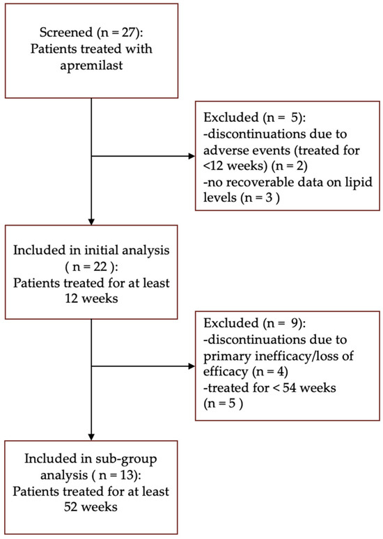 A total of 27 patients with psoriasis treated with apremilast were screened. Of the 27 patients, 2 patients discontinued apremilast before week 12 due to adverse events (gastrointestinal symptoms and COVID-19-related fatality). Additionally, three patients were excluded from analysis due to missing laboratory assessments of serum lipid levels. Data from the remaining 22 patients, who completed at least 12 weeks of therapy, were included in the initial analysis. Among these patients, five received treatment for less than 52 weeks, while four discontinued apremilast due to primary inefficacy or loss of efficacy before the 52-week endpoint. Subsequently, 13 patients met the criteria for inclusion in the subgroup analysis, having undergone treatment for at least 52 weeks (Figure 1).