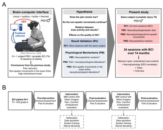 Implemented study design. (A) The left panel depicts the setup used, the patient’s characteristics, and main findings from a previous study [10]. The middle panel depicts the main questions and hypotheses tested in the present study. In the right panel, the characteristics and objectives of the study and the approaches taken to evaluate the patient’s condition throughout the testing period are presented. (B) Flow chart of the study. SCI: spinal cord injury; RV: result validation; PM: physiological mechanisms; BCI: brain–computer interface.
