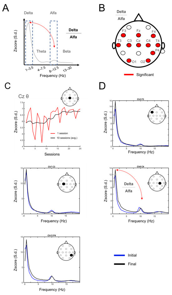 Electroencephalography data were recorded from 16 electrode channels Fp1, Fp2, F3, Fz, F4, C3, Cz, C4, T3, T4, Tp10, P2, Pz, P4, O1, and O2, placed following the 10–20 electrode system, at a sampling rate of 1000 Hz. The equipment used was V-Amp and actiCAP from Brain Products GmbH in Gilching, Germany, along with Brain Vision Recorder (version 2.1.0, Brain Products, Gilching, Germany). Subsequent offline data analysis was conducted with Brain Vision Analyzer (version 2.2.1, Brain Products, Gilching, Germany), as well as MATLAB (Mathworks, R2023a, Natick, MA, USA). During preprocessing, all channels were utilized as a reference for re-referencing. A 50 Hz notch filter was applied, and a zero-phase shift, 4th order Butterworth filter was employed with a low cutoff of 0.5 Hz and a high cutoff of 70 Hz, utilizing a time constant of 0.3183. Ocular artifacts were corrected using the Gratton and Coles algorithm, integrated into Visual Analyzer. Neural data analysis encompassed the entire acquisition phase of the session. A fast Fourier transform was subsequently applied with a resolution of 0.5 Hz. Power spectral analysis was performed within specific frequency bands: delta (0.5–4.5 Hz), theta (4.5–8.5 Hz), and alpha (8.5–13.5 Hz). Z scores were calculated, and comparisons were made between different groups of sessions using the permutation test (exact) as implemented in MATLAB.