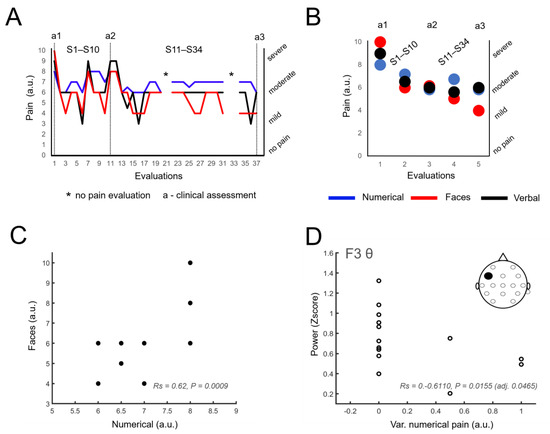 Evolution of pain levels on the different scales. (A,B) show (at each session and in intervals, respectively) a decrease in pain levels, obtained from the three different self-reported pain scales (numerical Visual Analogue Scale, Faces Pain Scale, and Verbal Pain Intensity Scale), during this study. (C) Observed correlation between numerical and faces pain scales from the reported values (Rs = 0.62, p = 0.0009). Note that some sessions have superimposed values and therefore, some circles cannot be observed in the panel. (D) Higher theta band power is correlated with a lower variability of the self-reported score of the VAS.