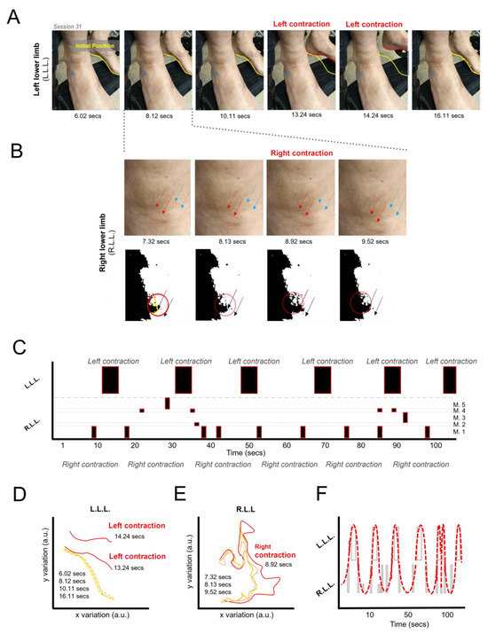 Alternating lower limb movement pattern. (A) Right (R.L.L) and left lower limb (L.L.L.) positions during an interval of approximately 10 s. The yellow line indicates the starting position, the orange lines indicate intermediate positions, and the red lines indicate the largest difference in position. (B) Top row: magnification of R.L.L frames. Bottom row: same video frames present in top row, with a black/white filter to show the right lower limb (R.L.L) micro-movements (red and blue arrows point to the observed muscle micro-contractions, red circle highlights the identified change) in video frame and graphical representation (light threshold mask, summary), respectively. Initial position (yellow line, 6 s), the position during a movement (red line, 13–14 s) and the return to the initial position (dashed yellow line, 16 s). Also, refer to Supplementary Materials Video S1. (C) Alternating pattern of muscle movements between the two lower limbs through time. (D) and (E) show, respectively, the graphical representation of the L.L.L. movements, as described above, and the graphical representation of the light threshold masks’ variation over time regarding the micro-movements seen in the right (R.L.L.; opposite) lower limb. Regarding (E), initial position (yellow line, 7 s), first position during a movement (orange line, 8 s), second position during movement (red line, 9 s), and end of the movement (pink line, 9.5 s). (F) Summary and graphical representation of the pattern with a line connecting the intervals between each lower limb movement (red dashed line).