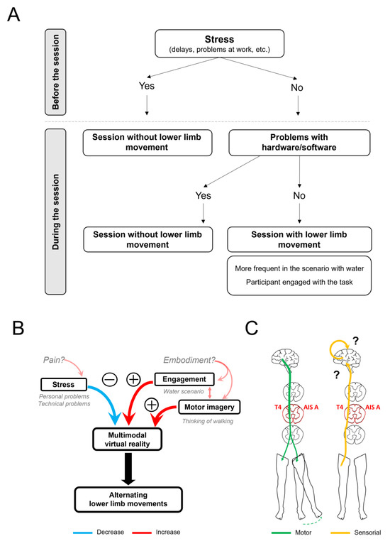 Factors that may influence the emergence of lower limb movements. (A) Decision tree proposing that lower limb movements are affected by stress-generating events. (B) Variables that may influence the appearance of the alternating pattern of lower limb movements seen during the brain–computer interface (BCI) sessions using multimodal (visual, auditive, thermal, and tactile feedback) virtual reality (VR). The red color indicates a positive modulation while the blue color indicates a negative modulation. (C) Potential efferent and afferent pathways activated with the use of this VR-based BCI protocol.