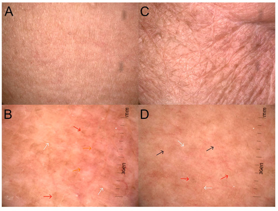 CRD on macroscopic images (A,C) across grades (G) G1 to G2, assessed according to RTOG criteria [17]. Dermoscopic images (B,D) are described according to the International Dermoscopy Society (IDS) by Errichetti et al. [18]. (A)—slight atrophy, pigmentation change (G1); (B)—linear vessels (orange arrows) in unspecific distribution, brown dots or globules (red arrows), and white lines (white arrows); (C)—patchy atrophy, total hair loss (G2); (D)—dotted vessels (black arrows) with unspecific distribution, brown dots or globules (red arrows), and white lines (white arrows).
