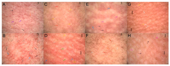 The description of the dermoscopic images of CRD based on the consensus of the experts for non-neoplastic dermatoses on behalf of the IDS [18]. (A)—dotted vessels (black arrows) and linear vessels (orange arrows) with unspecific distribution, and perifollicular pigmentation (purple arrows); (B)—dotted (black arrows) and linear with branch vessels (blue arrows) with clustered distribution; (C)—white patchy scale (yellow arrows), and brown dots and globules (red arrows); (D)—linear with branch vessels (blue arrows) with reticular distribution, perifollicular white color (green arrows), white patchy scale (yellow arrows), white lines (white arrows); (E)—linear with branches (blue arrows) and dotted vessels (black arrows) with clustered distribution and white structureless areas (pink arrows); (F)—linear vessels (orange arrows) with unspecific distribution, brown dots and globules (red arrows) and white lines (white arrows); (G)—white patchy scale (yellow arrows) and white lines (white arrows); (H)—dotted vessels (black arrows) in clustered distribution and white structureless areas (pink arrows).