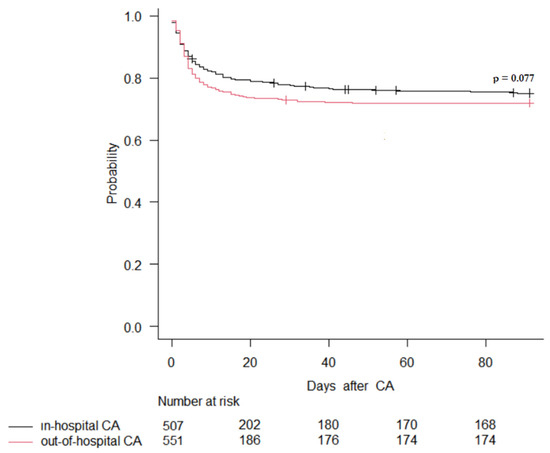 - Høybye, M.; Stankovic, N.; Holmberg, M.; Christensen, H.C.; Granfeldt, A.; Andersen, L.W. In-Hospital vs. Out-of-Hospital Cardiac Arrest: Patient Characteristics and Survival. Resuscitation 2021, 158, 157–165. [Google Scholar] [CrossRef]
