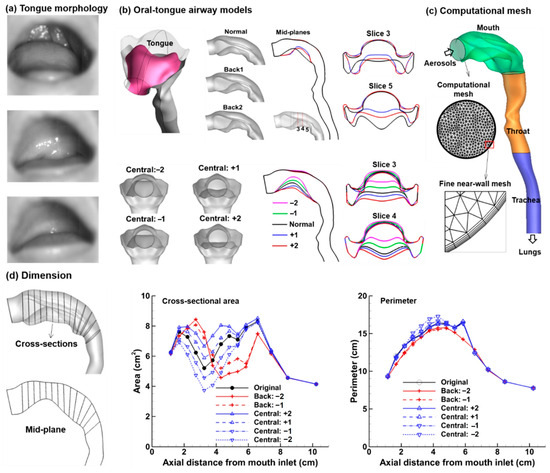 To generate different tongue positions (Figure 1a), HyperMorph (Troy, MI, USA) was used to modify an existing mouth-lung geometry. Briefly, the region of interest (ROI) was split into several sections, with handles specified at the boundary nodes of each section, like a scaffold surrounding a building. Moving these handles changed the overall shape of the scaffold, which, in turn, modified the morphology of the airway model within. By moving the local handles in a controlled, quantitative manner, the surface geometry of the tongue could be tuned to an intended shape and size. As shown in Figure 1b, the tongue morphology was changed in the middle and at the back. Due to geometrical constraints, the back tongue was only raised by two levels (i.e., Back 1 and Back 2 in the upper panel in Figure 1b). The central tongue was modified in both directions, i.e., being raised by two levels (Central: −1 and Central: −2, reducing the central oral airway) and tucked by two levels (Central: +1 and Central: +2, expanding the central oral airway), as displayed in the lower panel of Figure 1b. The computational mesh was correspondingly deformed (Figure 1c). The dimensions of modified models are compared in Figure 1d, which shows clear differences in the cross-sectional areas at the middle and back of the tongue. The differences in the volume and surface area among different models are listed in Table 1.