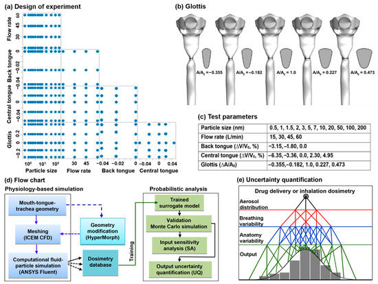 Figure 2d shows a flow chart for physiology-based CFD simulations and surrogate modeling-based probabilistic analysis. This first part involves reconstructing mouth-tongue-trachea geometrical models, meshing, conducting case-specific deposition simulations, HyperMorph-enabled geometry modification, and database development. In the second part, a surrogate dosimetry predictive model will be developed using the kernel-based Gaussian process regression (GRP) method. The trained model will be validated and then applied to perform Monte Carlo simulations, which rely on repeated random sampling to understand how input uncertainty affects the outcomes. Sensitivity analysis is conducted to determine how sensitive the results are to changes in each input parameter, thus identifying which variables have the most significant impact on the outcome and are, therefore, critical to the accuracy of the model. The final step is uncertainty quantification, which determines the uncertainty in the simulation outputs due to the input variability/uncertainty. This is crucial for understanding the confidence level of the simulation results and for making informed decisions based on those results. In this study, the propagation of uncertainty is illustrated in Figure 2e, where variability/uncertainty in aerosol distribution, breathing, and the respiratory airway interact to determine the uncertainty in the predicted dosimetry.