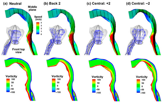 Inspiratory airflow streamlines (upper panels) and vorticity (lower panels) in the oropharyngeal airway: (a) neutral position, (b) Back 2 (back-raised), (c) Central: +2 (central-tucked), and (d) Central: −2 (central-raised). The streamlines are seeded at identical positions at the mouth inlets but exhibit very different trajectories due to the changing tongue positions.