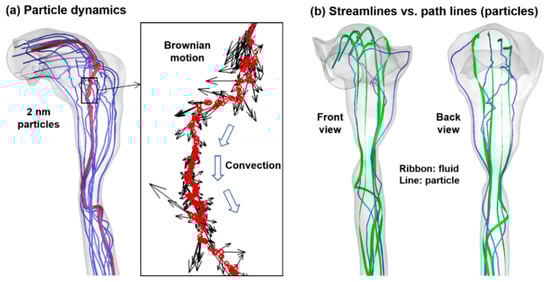 Nanoparticle dynamics: (a) path lines of 2-nm particles under the influence of convection and diffusion (Brownian motion). (b) Airflow and aerosol particles can have different trajectories, even when released from identical locations. Blue: particles; green ribbon: airflow.