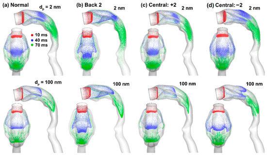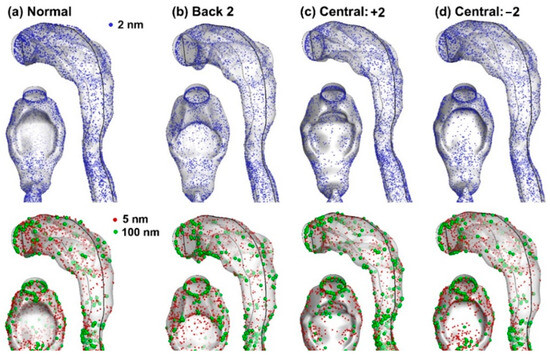 Surface deposition of nanoparticles due to different tongue positions: (a) Normal, (b) Back 2, (c) Central: +2, and (d) Central: −2. Different deposition patterns exist between different particle sizes: 2 nm (upper panel) vs. 5 nm (red, lower panel) vs. 100 nm (green, lower panel).
