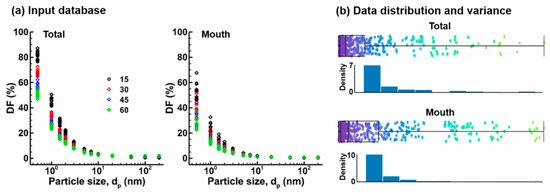 Training database of deposition fractions (DFs) from physiology-based simulations: (a) DF vs. particle size in the total oropharyngeal airway and mouth for different breathing conditions and tongue/glottis shapes; (b) highly skewed distributions of the DF data based on the arithmetic scale.