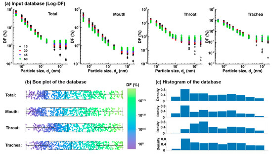 Preprocessing of the training database using the logarithmic scale: (a) DF vs. particle size in the total oropharyngeal airway, mouth, throat, and trachea for different breathing conditions and tongue/glottis shapes; (b) boxplot of the input data with approximately normal distributions based on the logarithmic scale, and (c) histogram of the database on the logarithmic scale.