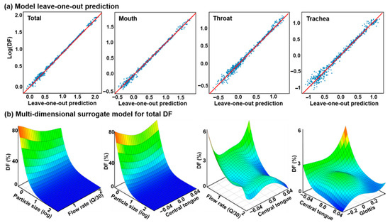 It is noted that the surrogate model included the effects of five input factors. To visualize the model, 3D response surfaces were plotted vs. four pairs of input variables on a 50 × 50 grid, which exhibit very different response patterns (Figure 9b). The first panel in Figure 9b displays the response surface of the total DF as a function of particle size (dp) and flow rate (Q), which accurately captures the trend of a decreasing DF with increasing particle size and flow rate. A more dramatic decrease in DF with particle size than with flow rate was also captured. In contrast, the relationship between DF and the central tongue appears nonlinear, as shown in the second panel of Figure 9b, indicating a complex interplay between airflow, particle motion, and airway morphology. This complexity is even more pronounced when combined with the influences from the breathing conditions (the third panel) or other morphological factors (the fourth panel). The predictive surrogate model, or the trained emulator, provides an implicit tool that can accurately approximate the input-output relationship of the system and be used for future design exploration and analysis.