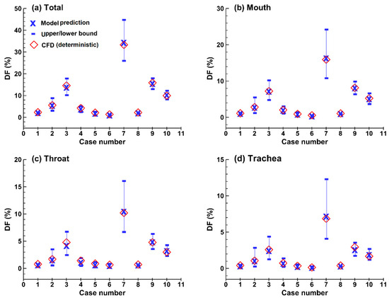 High predictive accuracy of the surrogate model demonstrated by comparison to deterministic (computational fluid dynamics, or CFD-predicted) results for ten randomly generated test cases (Table 2) that have not been included in the training database: (a) total DF, (b) mouth DF, (c) throat DF, and (d) trachea DF.