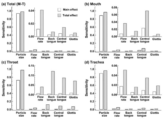 Considering the effect of tongue position, high sensitivity values are observed in the three regions of the mouth-throat geometry. Except for the particle size, the central tongue postures contribute the highest variability to the deposition in the mouth (Figure 11b), while the back tongue postures contribute the most to throat deposition (Figure 11c). The interaction between tongue postures and other factors is also significant. For the back tongue posture, the total-over-main increment ratio ranges from 1.46 (MT) to 25.87 (throat); for the central tongue posture, the ratio ranges from 1.96 (MT) to 11.95 (MT), as shown in Table 3.