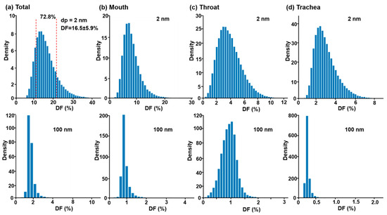Uncertainty quantification (UQ) in DF due to the variability of five input factors (particle size, flow rate, central tongue, back tongue, and glottis, as listed in Table 4) in the (a) total oropharyngeal airway, (b) mouth, (c) throat, and (d) trachea. The upper panel shows the UQ for 2 nm aerosols, while the lower panel is for 100 nm aerosols.