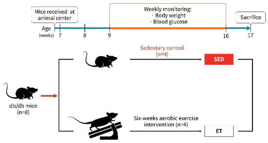 Illustration of animal model and research design. Eight-week-old male db/db mice (n = 8) were divided into two groups: the first group underwent six weeks of aerobic exercise training (ET, n = 4), and the other group was used as a sedentary (SED, n = 4) control.