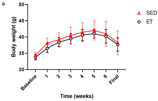 The total body weight of the db/db mice in the SED and ET groups showed no notable change from the intervention period from week one to week six, although there was a slight decrease in the ET group compared to the SED group (Figure 2a). As anticipated, the ratio of gastrocnemius and soleus muscle weight to body weight in the SED and ET groups showed a moderate increase in the ET group compared to the SED group (Figure 2b,c).