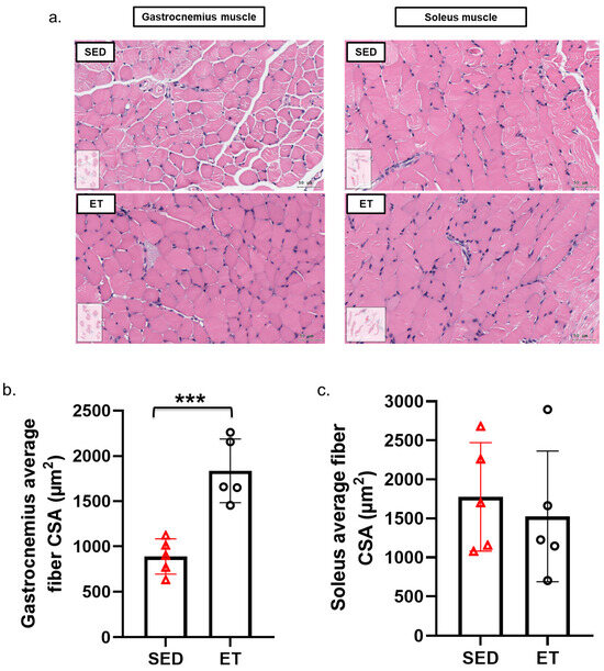 Impact of aerobic exercise on skeletal muscle composition. (a) Morphological changes in gastrocnemius and soleus muscle depicted use the hematoxylin and eosin (H & E) staining method (scale bar = 50 µm). Average fiber cross-sectional area (CSA, µm2) of the gastrocnemius (b) and soleus (c) quantified via H & E staining in each group (SED and ET) using ImageJ. Each group consisted of four mice. Statistics are reported as mean ± SD determined using an unpaired t-test (two-tailed p-value). The p-values are denoted as <0.001 *** between the SED and ET mouse groups. CSA—cross-sectional area, ET—mouse group (n = 4) that was subjected to a six-week aerobic exercise intervention, H & E—hematoxylin and eosin, and SED—sedentary control group (n = 4).