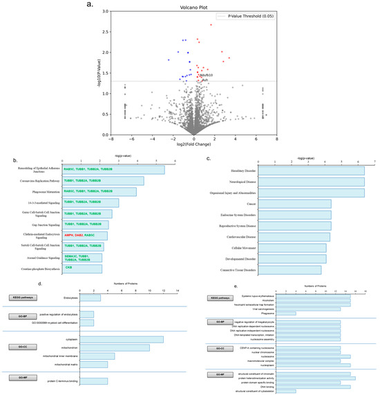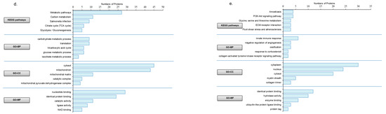 Impact of aerobic exercise on proteomic analysis of gastrocnemius muscle. (a) Illustration of proteomics data using a volcano plot. The x-axis and y-axis represent the (FC) and (p-value) of protein levels, respectively. Red and blue circles represent significant upregulated and downregulated proteins, respectively. Grey circles indicate no differences in protein levels. The cutoff value of (p-value), set as 1.3, is represented by a horizontal dotted line (grey color). Fold change of DEPs greater than ±1.1 ((FC) > 0.14 or <0.14) were considered increased or decreased expression. The bar graphs show canonical pathways (b) and pathological biofunctions (c) modulated by DEPs in the gastrocnemius muscle of the ET group compared to the SED group. The canonical pathways minimum threshold of (p-value) was set as more than or equal to 1.3 (red bold font indicates upregulated DEPs and green bold font indicates downregulated DEPs). Functional enrichment analysis of upregulated DEPs (d) and downregulated DEPs (e) in the gastrocnemius muscle of ET mice including KEGG pathways and gene ontology (GO) analysis, including BP, CC, and MF. BP—biological processes, CC—cellular component, DEPs—differentially expressed proteins, ET—mouse group (n = 4) that was subjected to a six-week aerobic exercise intervention, FC—fold change, GO—gene ontology, KEGG—Kyoto encyclopedia of genes and genomes, MF—molecular function, and SED—sedentary control group (n = 4).
