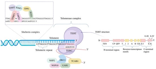 - Zvereva, M.; Shcherbakova, D.; Dontsova, O. Telomerase: Structure, functions, and activity regulation. Biochemistry 2010, 75, 1563–1583. [Google Scholar] [CrossRef]