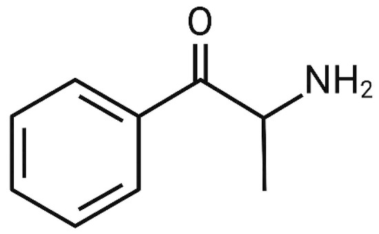 Synthetic cathinones are a group of psychostimulant designer drugs that are included in the NPS category. They are usually labelled with “not for human consumption”, “jewellery cleaner”, and “phone screen cleaner” and sold as “bath salts” and “plant food” in order to convey a false idea of security and legality. The aim of their development is not only to provide similar effects to conventional drugs of abuse, such as amphetamines, 3,4-methylenedioxymethamphetamine (MDMA), and cocaine, but also to be less expensive and easily obtained, triggering their replacement. The synthetic cathinones group derives from the natural stimulant ingredient produced by cathinone (Figure 1), which is found in the leaves of the khat plant (Catha edulis) [6,7,8,9,10]. Cathinone is an alkaloid with a similar structure and effects to amphetamine, and its most common routes of administration are nasally and orally [6,9]. However, when harvested, the fresh leaves of the khat plant can be chewed, as occurs in Yemen and East African countries as a social habit [11]. The administration of synthetic cathinones can cause euphoria and increased alertness, but their abuse can lead to serious cardiac, psychiatric, and neurologic effects [8,9]. When consumed in higher doses, they can provoke delirium and hallucinations, hyperthermia, tachycardia, and hypertension [12].